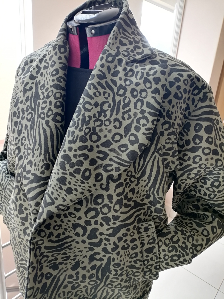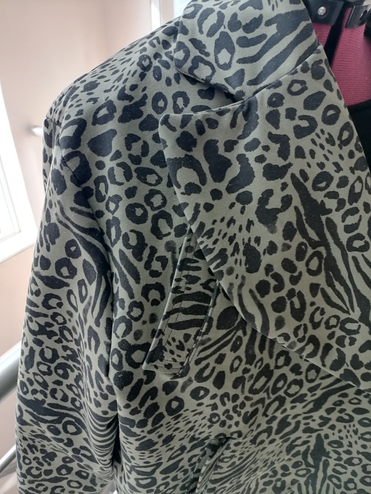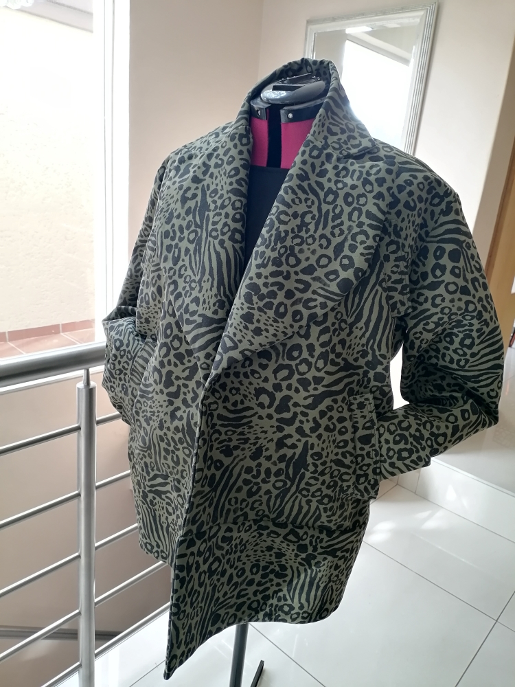 - Elevate your winter wardrobe with our ladies Olive Green leopard print jacket featuring a bold Leopard print and statement Cloverleaf wide Lapel. Crafted from a Cotton fabric and designed with added inner structure for warmth, this jacket is both stylish and functional. It includes welt pockets on the chest and waistline, adjustable wrist straps for a tailored touch. A standout piece for layering in colder weather.